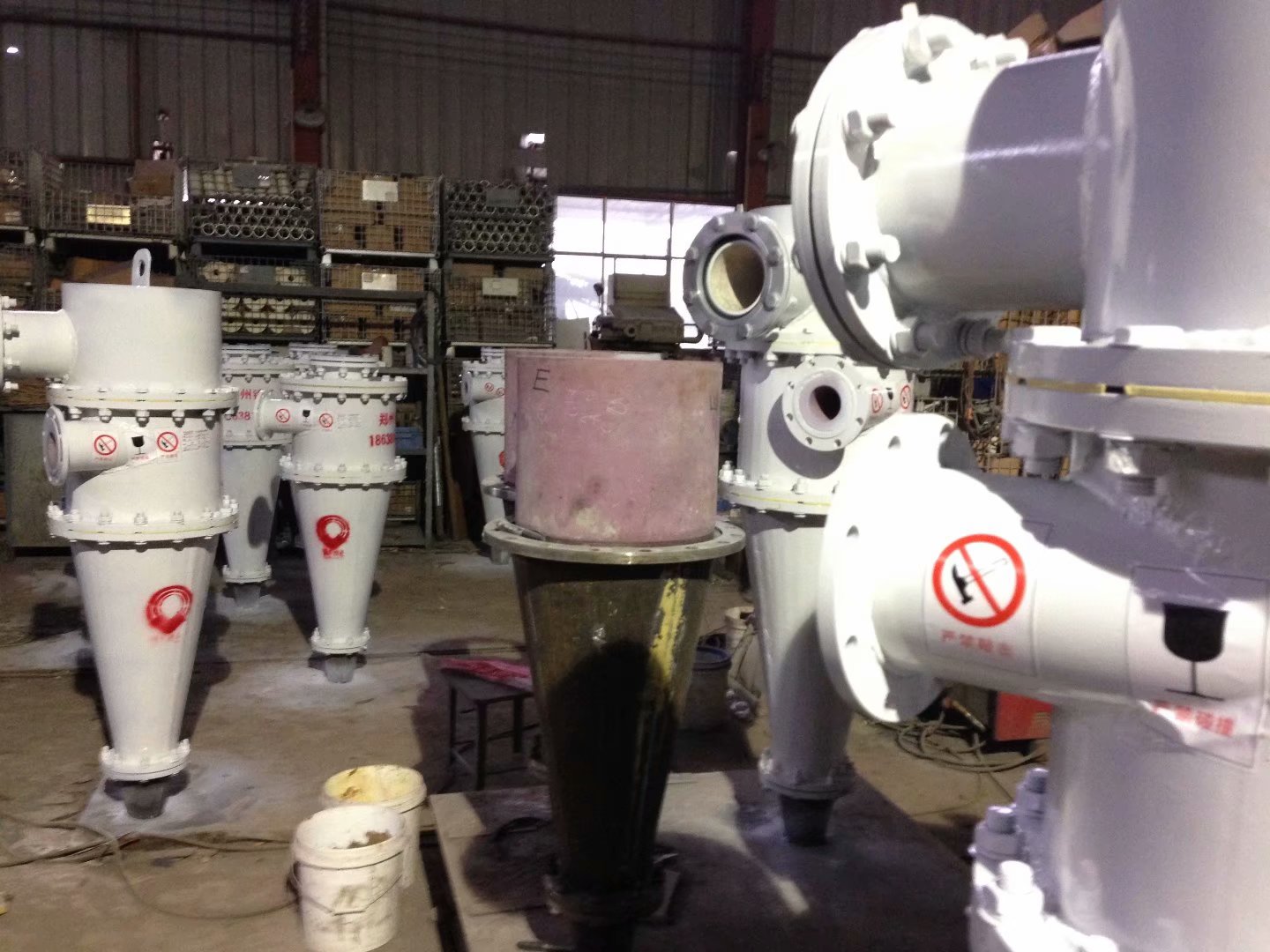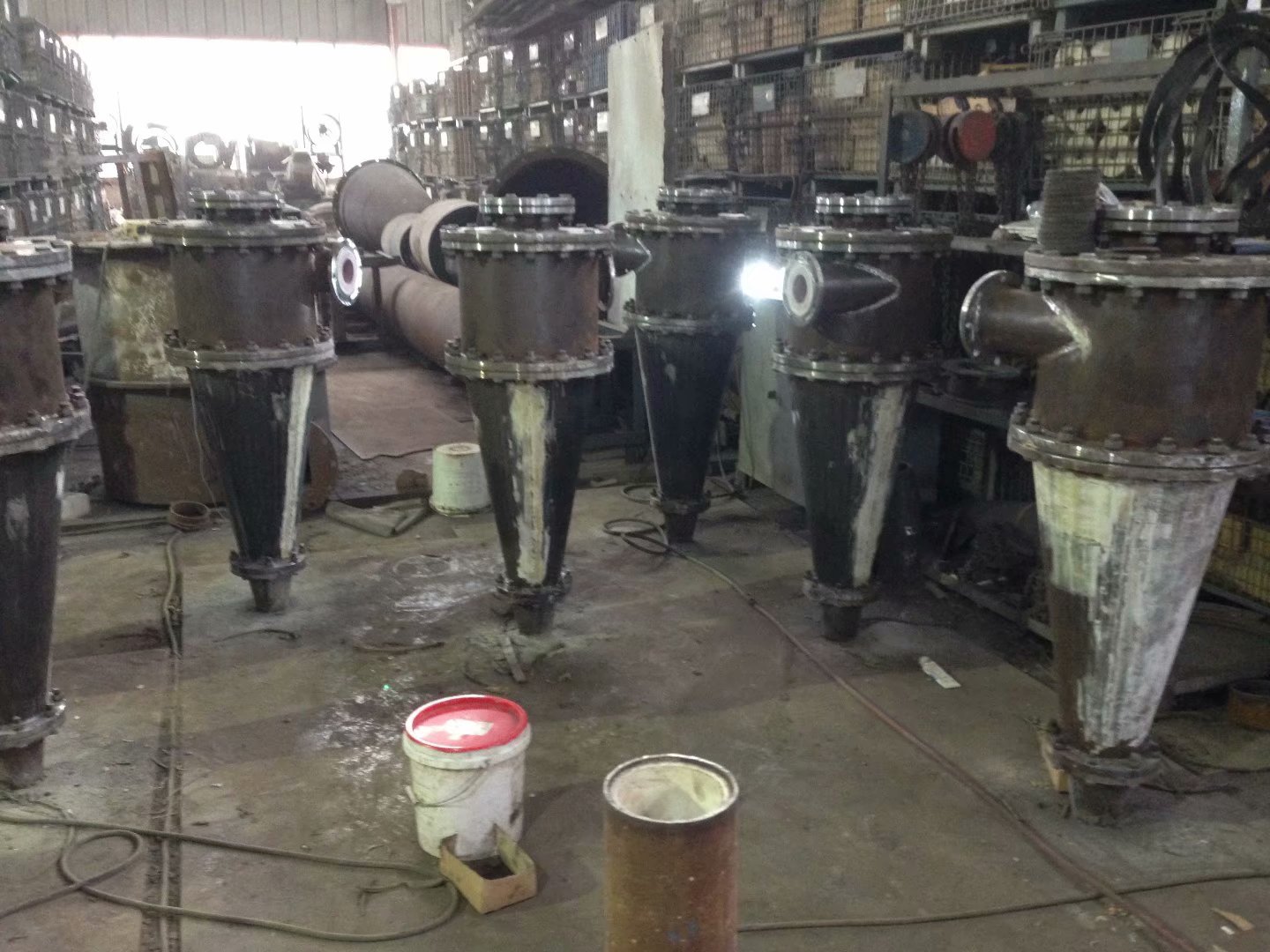 旋流器錐體是一種利用流體壓力產(chǎn)生旋轉(zhuǎn)運(yùn)動(dòng)的裝置。當(dāng)料漿以一定的速度進(jìn)入旋流器,遇到旋流器壁后被迫做回轉(zhuǎn)運(yùn)動(dòng)。由于料漿中的固體顆粒所受的離心力大,能夠克服水力阻力向器壁運(yùn)動(dòng),并在自身重力的共同作用下,沿器壁螺旋向下運(yùn)動(dòng),而細(xì)小的顆粒及大部分水則因所受的離心力小,未及靠近器壁即隨料漿做回轉(zhuǎn)運(yùn)動(dòng)。在后續(xù)給料的推動(dòng)下,料漿繼續(xù)向下和做回轉(zhuǎn)運(yùn)動(dòng),于是粗顆粒繼續(xù)向周邊濃集,而細(xì)小顆粒則停留在中心區(qū)域,顆粒粒徑由中心向器壁越來越大,形成分層排列。隨著料漿從旋流器的柱體部分流向錐體部分,流動(dòng)斷面越來越小,在外層料漿收縮壓迫之下,含有大量細(xì)小顆粒的內(nèi)層料漿不得不改變流動(dòng)方向,轉(zhuǎn)而向上運(yùn)動(dòng),形成內(nèi)旋流,自溢流管排出,成為溢流,而粗大顆粒則繼續(xù)沿器壁螺旋向下運(yùn)動(dòng),形成外旋流,最終由底流口排出,形成沉砂。