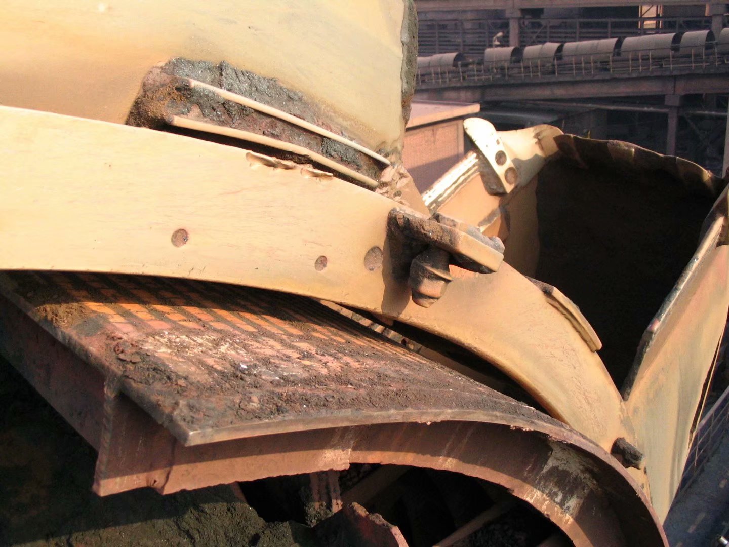煤場單斗輪取料機(jī)長期堆起煤粉,磨損嚴(yán)重,采用陶瓷弧形襯板及平面陶瓷受卸板,抗磨抗折緩沖性能好,使用效果明顯。
