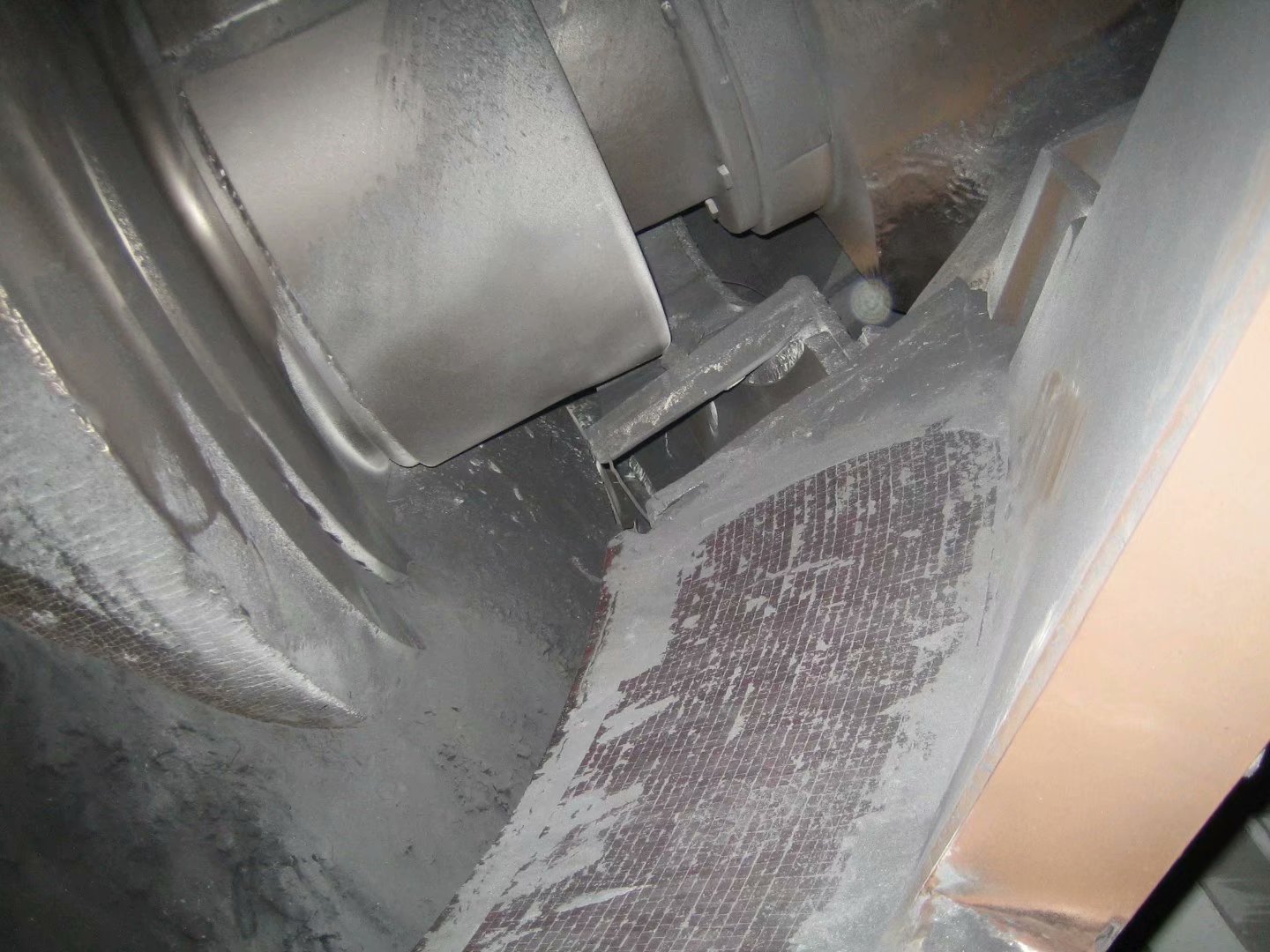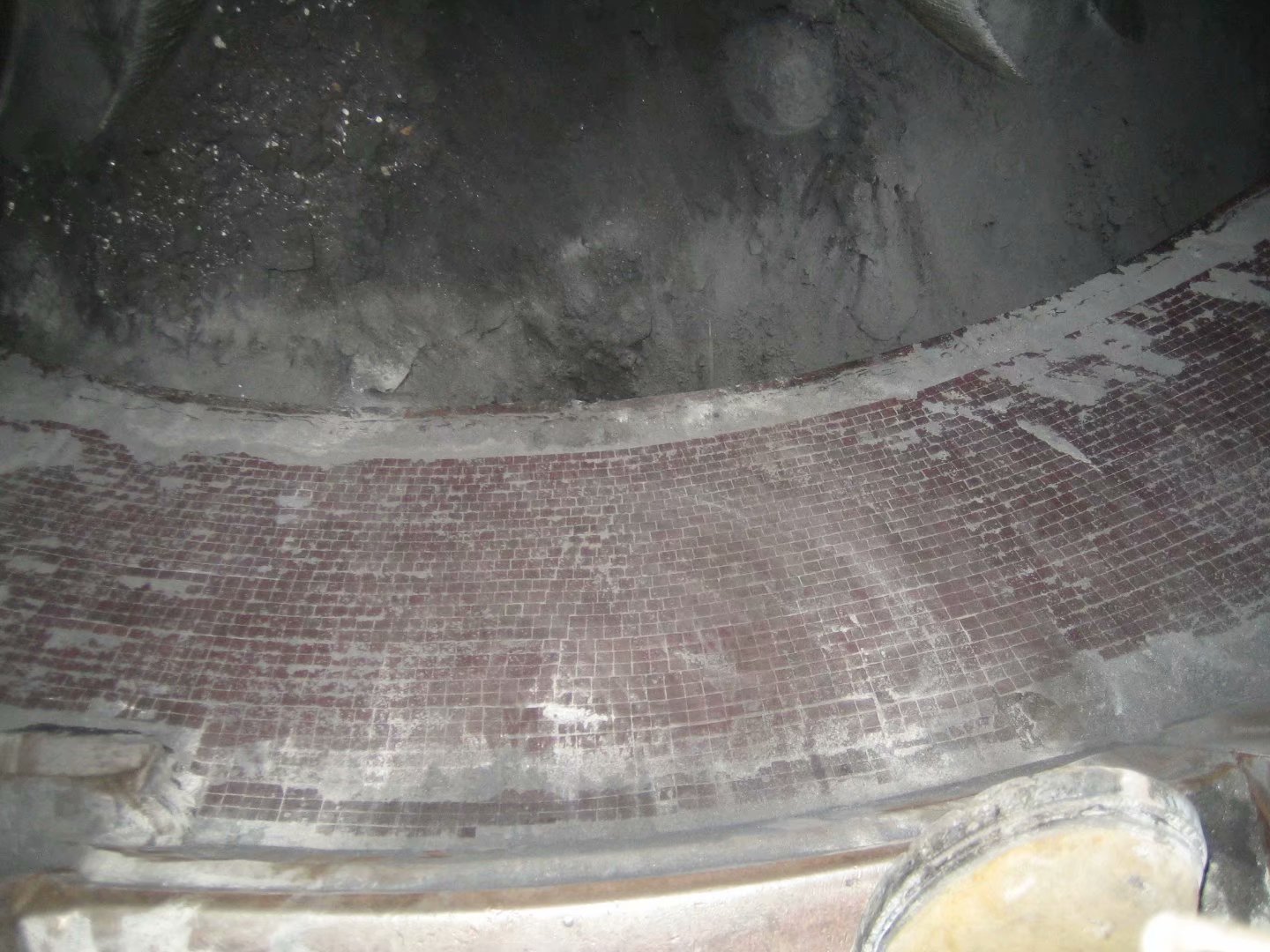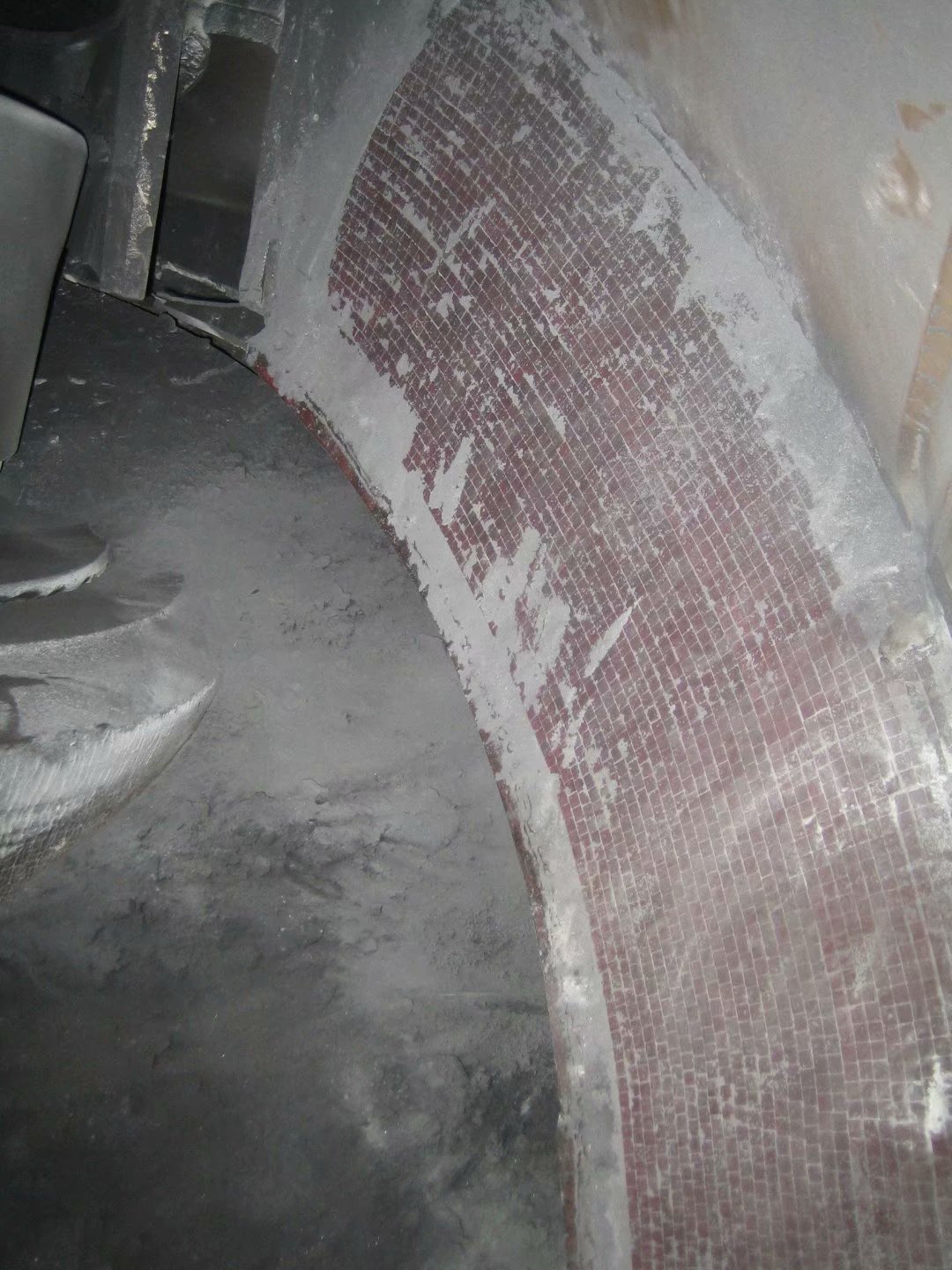 磨煤機(jī)本體及進(jìn)出口粉管受煤粉的沖刷磨損嚴(yán)重,由于筒體較大,防磨措施有用耐磨鑄石、敷膠泥或焊接耐磨鋼板。但由于防磨層厚、易開裂。并且焊接耐磨鋼板則很笨重,從有些電廠的使用情況看,效果也不太理想,使用不到一年,即出現(xiàn)局部磨穿。在此部位的磨損修補(bǔ)已更換為粘貼耐磨陶瓷,在運(yùn)行一年后檢查,除在邊緣有個別脫落外(因?yàn)檫吘壨谘a(bǔ)時處理得不太平整所致),其它部位完好無損,抗磨效果良好。